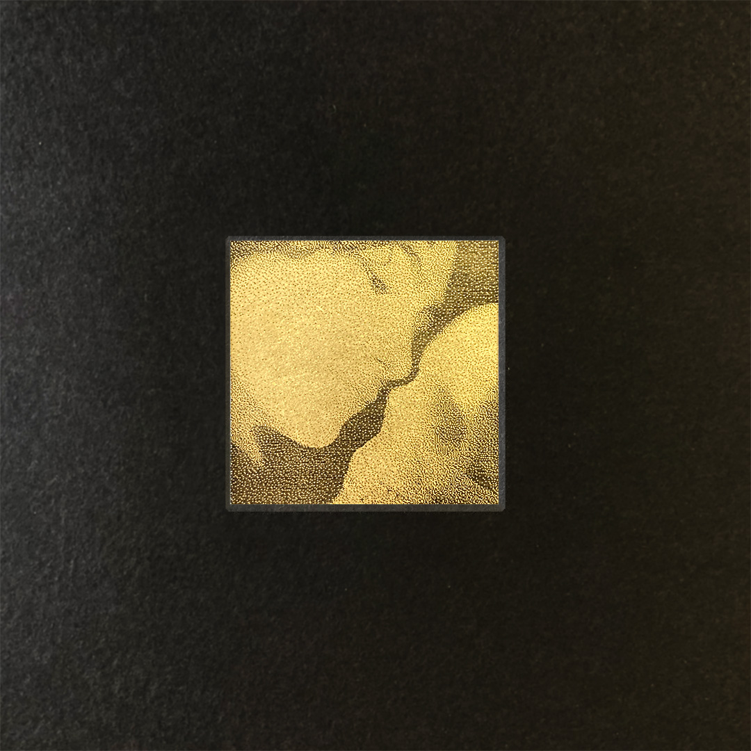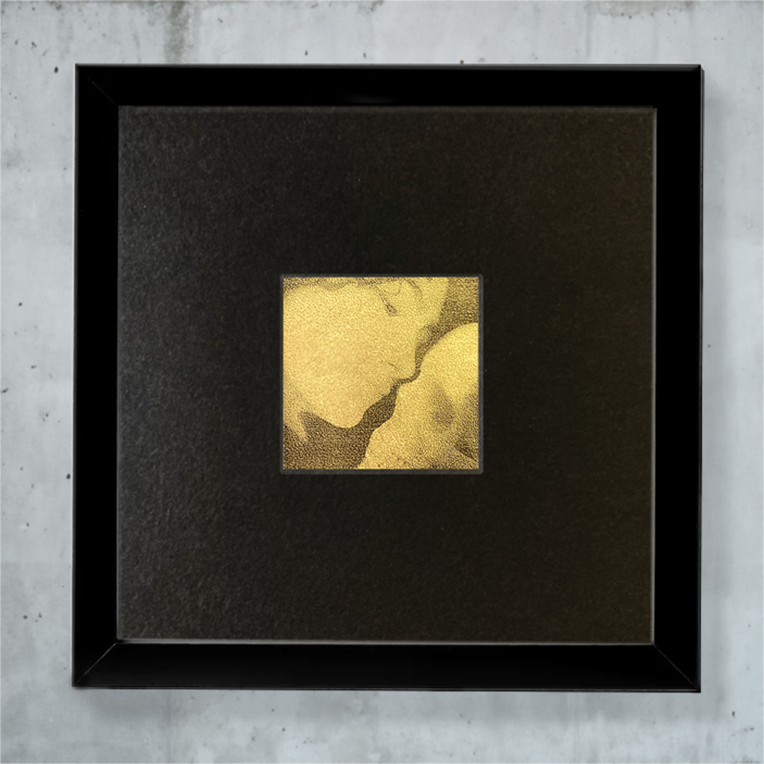 « La jeune fille… » dessin au plotter sur feuille d’or à l’encre indélébile à l’huile. Enluminure contemporaine de 7x7cm encadrée avec passe partout noir et cadre noir 20x20cm.